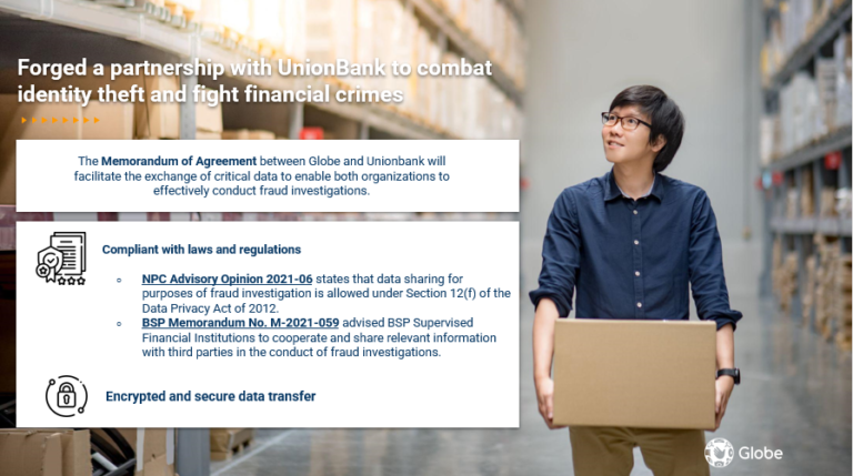 UnionBank is confident that its partnership with Globe will help facilitate faster data gathering in fraud investigations linked to the use of mobile numbers, as the agreement does away with the need for court orders for such information exchange.