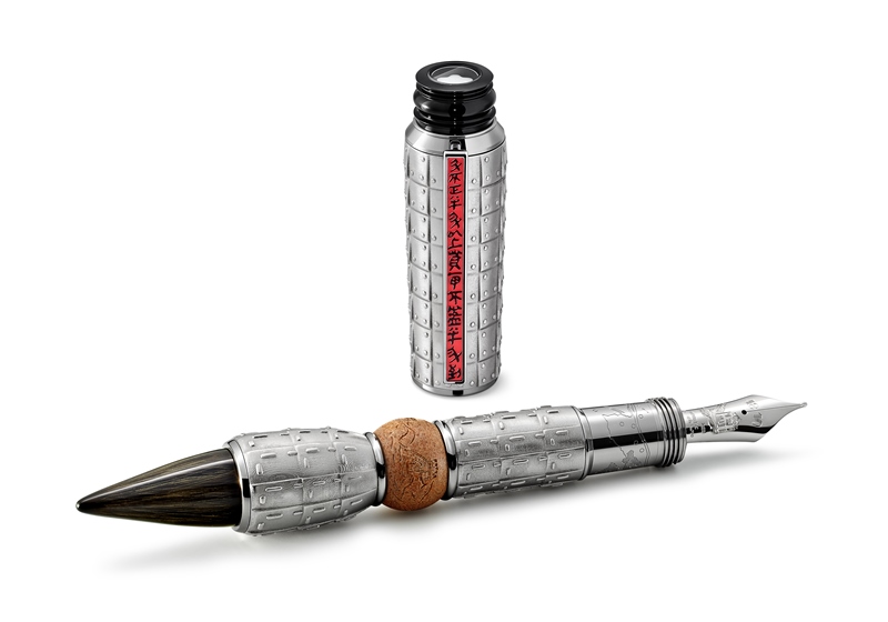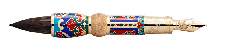 The upper part of the cone is set with black sapphires and diamonds, and the cone is remodelled as a calligraphy brush, made of goat and synthetic hair, stabilized with translucent lacquer. The Au 750 solid champagne-tone gold clip with a wood inlay is lasered with Chinese symbols reminiscent of the narrow bamboo strips that scribes used to write or draw on. The fine engraving on the precious Kalahari jasper revolving barrel ring is dedicated to the tale of Lady Meng.