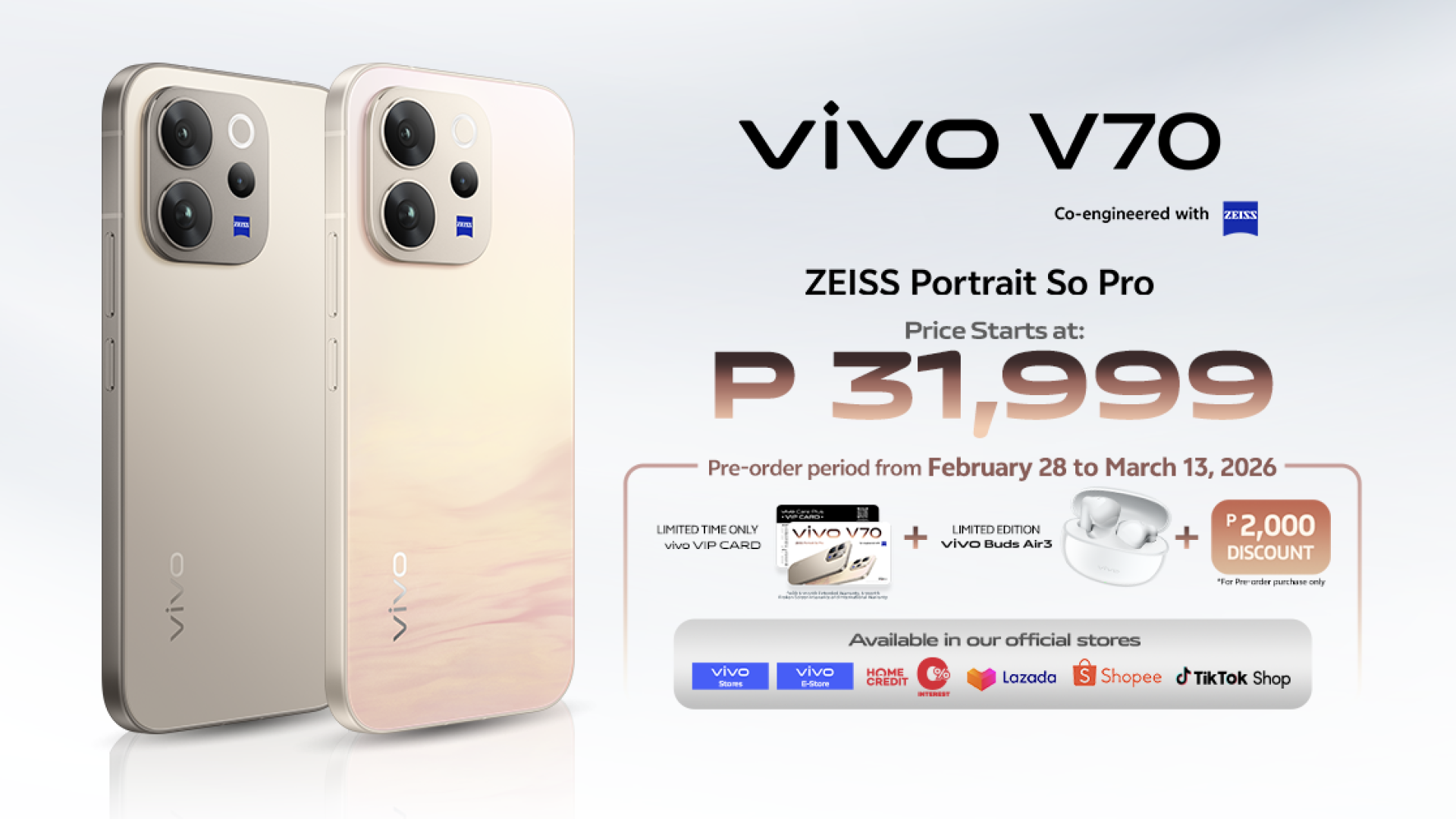 Available for pre-order from February 28 to March 13, 2026 in vivo stores nationwide, customers who secure their unit early can enjoy a Php 2,000 discount plus limited-edition freebies including a vivo VIP Card with 6-month extended warranty and 6-month broken screen insurance, along with vivo Buds Air3.