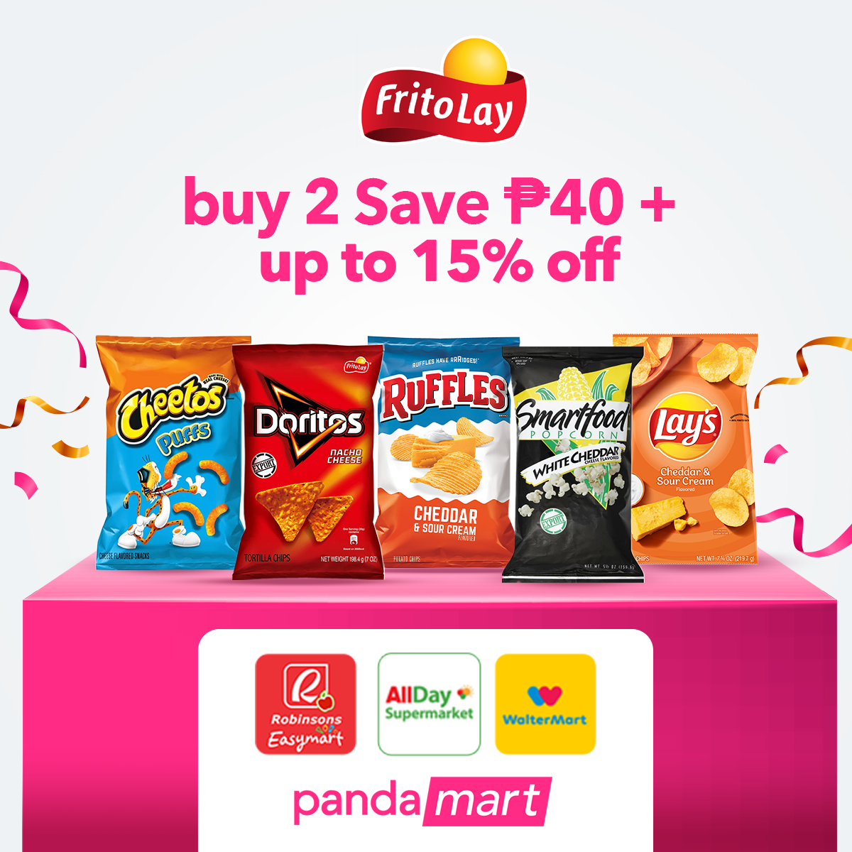 It’s almost the weekend, and you’re preparing for a barkada hangout or a movie marathon with your family. To complete that get-together experience, buy your chips and snacks from Fritolay and save up to 15% off. Take a pick from Lay’s, Doritos, Smartfood, Ruffles, and Cheetos to munch on and enjoy alongside your loved ones and friends.