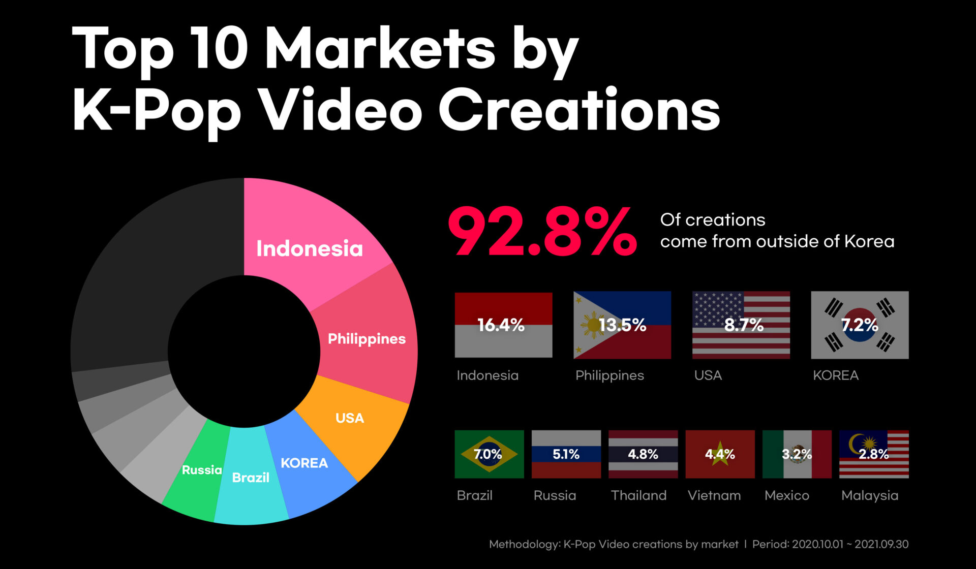The study revealed an exponential growth in K-pop content on TikTok over the last three years, with the number of such videos tripling from 33.5 million in 2019 to over 97 million in September 2021. 92.8% of these videos were made outside Korea, with Indonesia emerging as the top creator (16.4%). This was closely followed by the Philippines (13.5%) and the United States (8.7%).