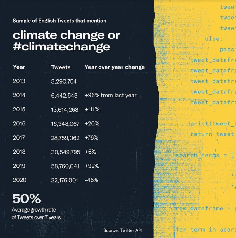 The extent of extreme weather events is reflected in public conversations on Twitter too. A sample of English-language Tweets from 2013 to 2020 indicated that mentions of “climate change” grew an average of 50% over seven years.